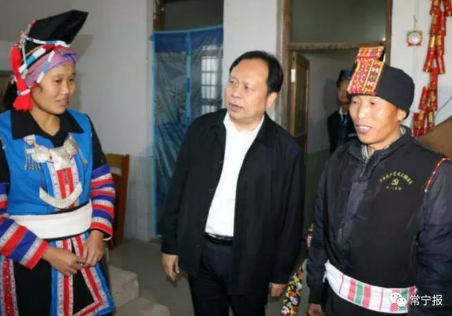 周农一行先后深入贫困户家中、狮园村村级综合服务中心、狮园完小等地调研。一到塔山狮园村,周农立即走下车,看到老百姓跟过节似的,个个喜气洋洋、兴高采烈,他也露出了笑容,马不停蹄地走入已脱贫村民柏盈富、雷连方和盘小红家中走访,了解其生活生产等情况。看到自己帮扶的盘小红家通过上级扶贫资金和帮助,加入天堂塔山合作社,并养殖竹鼠,截至9月,2017年竹鼠收入近7万元,其他收入3600多元,已于2016年脱贫,周农特别高兴,并叮嘱盘小红夫妇要帮助和带领本村贫困户共同脱贫致富奔小康。